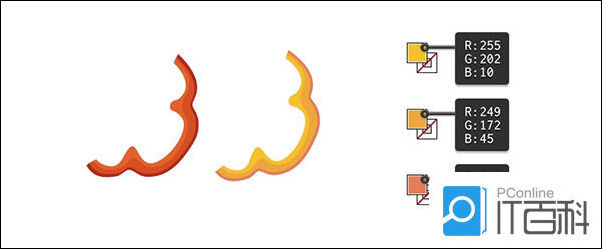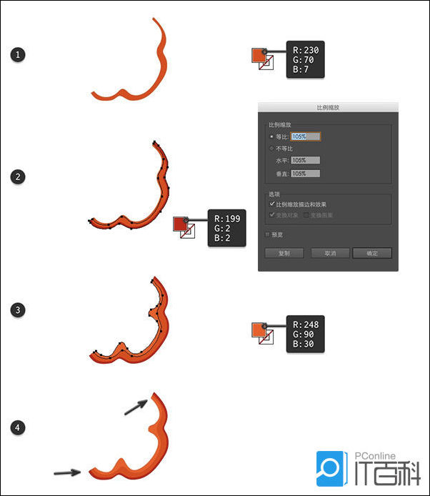 接下来的部分是红辣椒,用钢笔工具绘制辣椒片的形状,并使用红色作为填充颜色如图(1)所示。 选中此形状,执行对象>变换>缩放,在缩放等比中输入105%,然后单击复制。 得到一个稍大一点的形状。 使用较深的红色阴影填充它并将它放到最后一层,如图(2)所示。