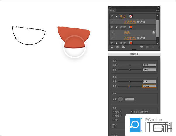 接下来,开始画西红柿的心,在上面绘制一个类似但较小的形状,并用红色填充。 在第一个下面添加一个新的填充,并使用较暗的橙色。 在“外观”面板中选择“填充”属性后,执行“效果”>“扭曲与变换”>“变换”,并应用1像素垂直移动。