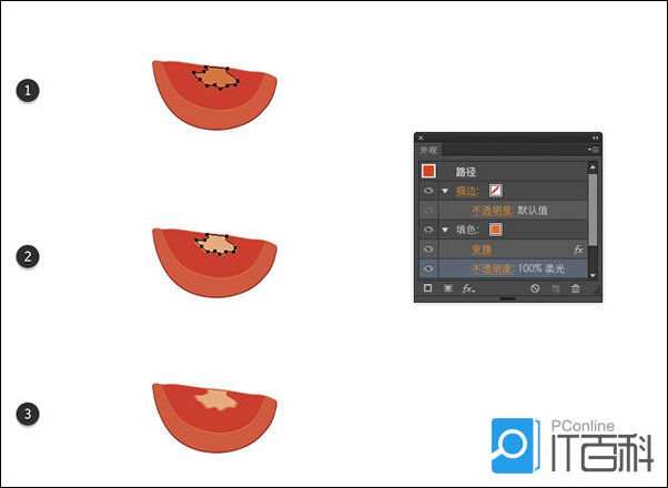 使用钢笔工具绘制番茄切片,并用深色的红色填充, 当形状保持选中时,在第一个“外观”面板中添加一个新填充,并使用橙红色。 选择此填充属性,执行效果>扭曲和变换>变换并应用显示的设置,便得到一个较暗的边缘形状。