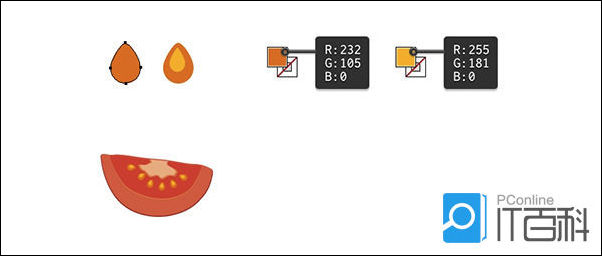 接着画番茄的种子,需要两个泪滴形状。 用深橙色填充较大的一个,较小的一个用黄色填充。 打成两个组,复制并旋转得到更多的种子; 并将其排列在番茄片上。