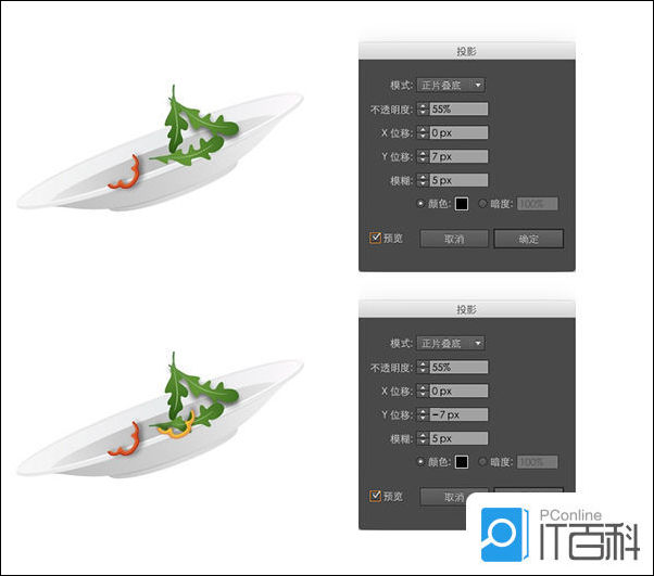 接下来,拖过“红辣椒”组,将其移到盘子上。 应用风格化“阴影”效果创建阴影。 “黄胡椒”组也是一样。