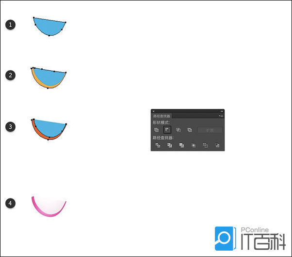 选择蓝色形状,然后复制并粘贴到本位,并放在所有内容的前面。 选择此副本以及橙色形状,点击“路径查找器”面板中按相减。 由此可得到底部的形状作为萝卜的皮肤如图(3)。 选择径向填充两个形状,并打包两个组,萝卜切片效果如图(4)。