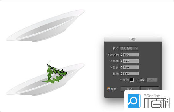 如果想使超过盘子的边缘更加真实,可以添加一个叶子,在盘子外面。 将其排列在所需的位置,然后应用“阴影”效果。