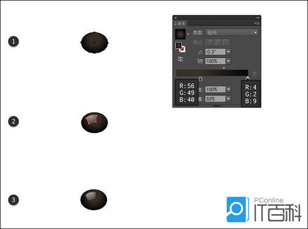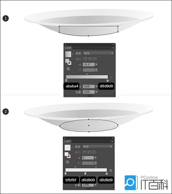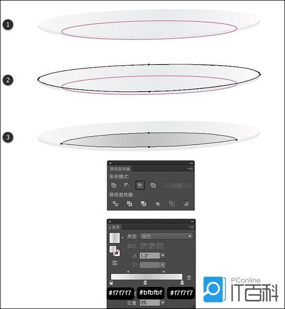 在盘子的中心,绘制一个大约480 x 58像素如图(1)的新椭圆。 选择并复制并粘贴,一个新的副本椭圆如图(2), 当此副本(黑色椭圆)和红色椭圆保持选中状态时,点击路径查找器面板中的相交按钮。 填充线性渐变得到新形状如图(3)。