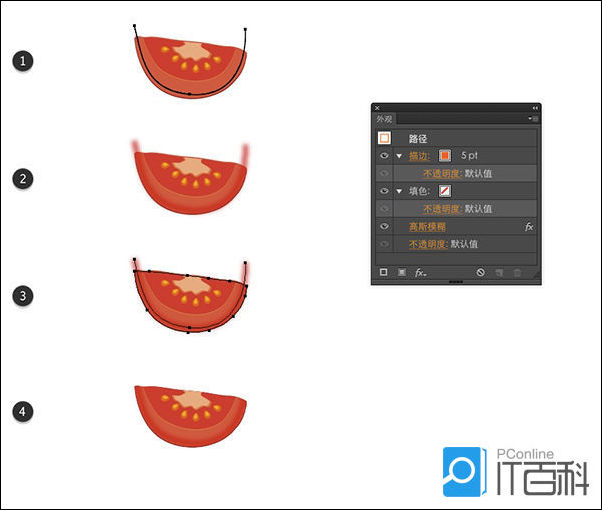 现在,用钢笔工具绘制一个弯曲的切片形状放在番茄的横切面底部, 给它一个5像素的红色描边; 然后执行效果>模糊>高斯模糊,设置模糊半径2像素, 将不透明度降低到70%如图(2)。