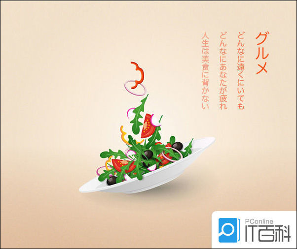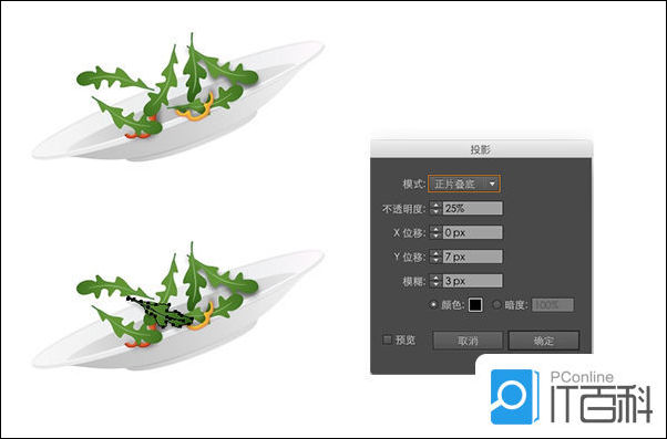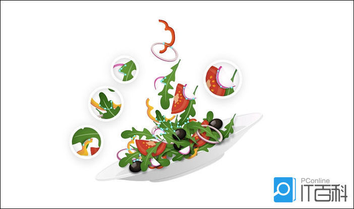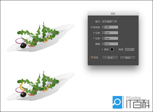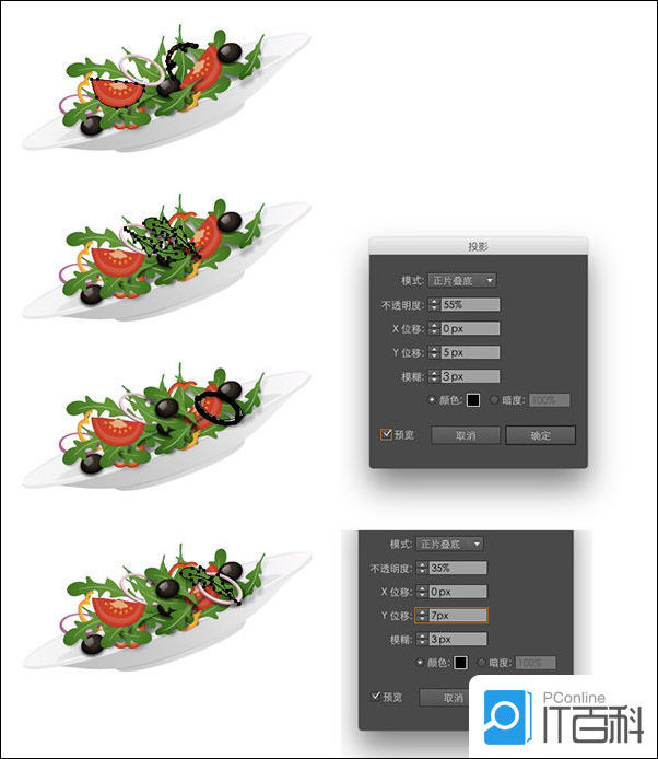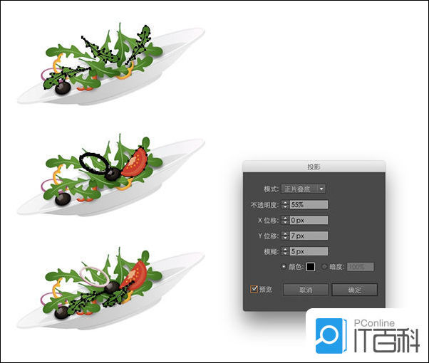 这种沙拉有很多阴影,选择最终添加它们,看到最后的图片,会有点没有头绪,有这么多的组件。 为了变得更容易理解,将会在这里介绍阴影效果的设置,这些设置与步骤之间略有不同,因为它们取决于每种成分的位置。