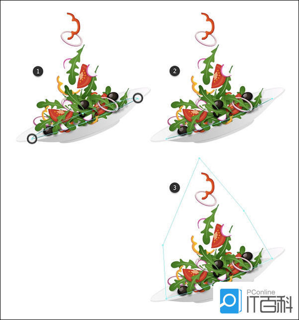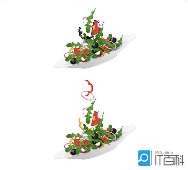 从盘子的内部选择椭圆,然后复制并粘贴到本位,以便将其复制到所有内容如图(1)之前。使用剪刀工具(,然后点击该副本的两个端点,将形状剪切成两个,并将前半部分保留如图(2)。 使用钢笔工具(P)关闭此路径,并在沙拉周围创建一个新形状如图(3)。现在,选择沙拉的所有成分和这个形状,然后执行对象>剪切蒙板> 建立,这些多余的蔬菜都被隐藏掉。