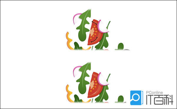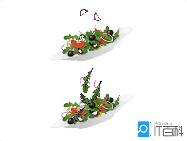 现在,细化空气中的部分,特别是在它们重叠的地方,因为你需要一个阴影。尽可能多地放大,并绘制一条小路径,其中两个成分在其轮廓之后重叠,但不要超过边缘(进入白色背景)。 可以在特写中看到几个例子, 绘制的路径越多,沙拉就会越详细和逼真。