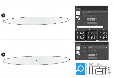 画一个大约610 x 75像素的椭圆,填充如图(1)所示的线性渐变。 然后画出另外一个略大于底部的椭圆,并放到第一个椭圆的后面,如图(2)所示。