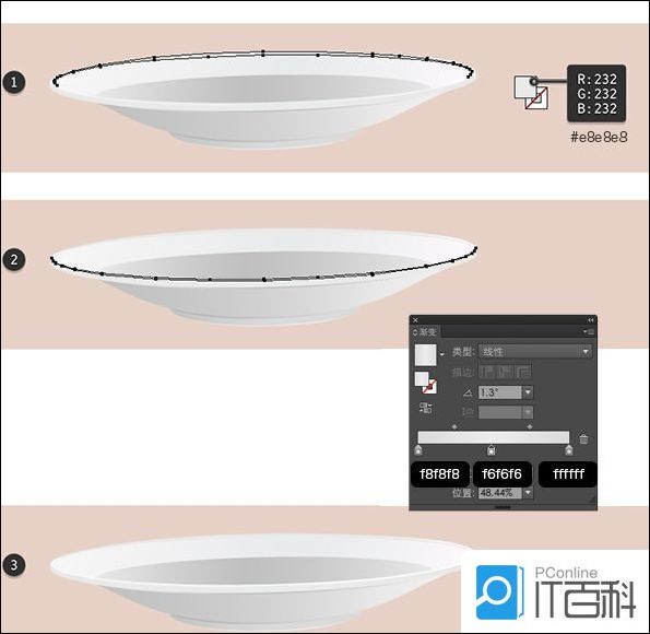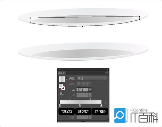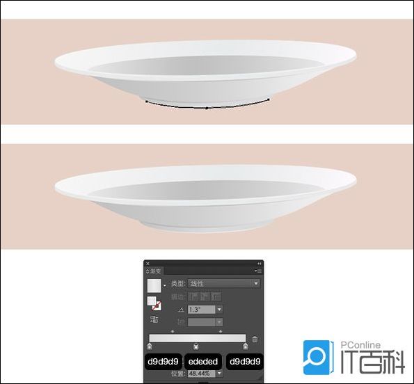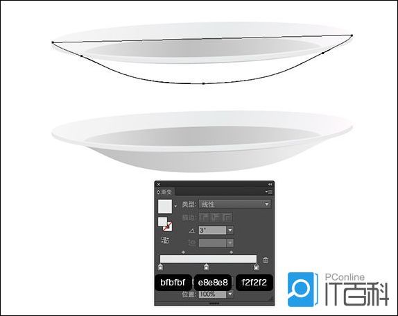 要在盘子底部做一个高光,使用钢笔工具沿着底边绘制非常薄的形状,线性渐变填充。为了好辨认高光的颜色,我们给背景填充了颜色。