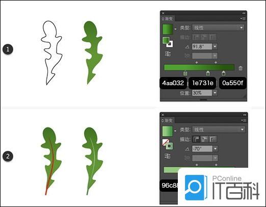 接下来,我们绘制叶脉的形状,并填充渐变色如图(2)所示。叶子画好以后把这两个形状打成一个组,并命名组“芝麻菜”。