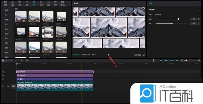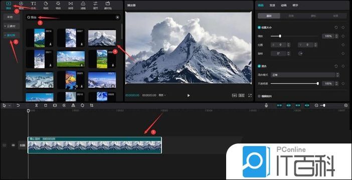 点击 媒体按钮 ,然后点击素材库按钮,在搜索栏中输入雪山两字, 选择一段视频 ,将其添加到视频轨道中,见下图。