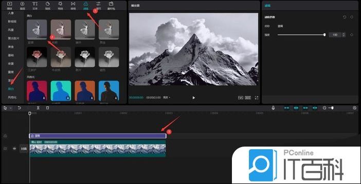 点击 滤镜按钮 ,选择黑白中的蓝调滤镜,将其添加到 滤镜轨道 中,见下图。