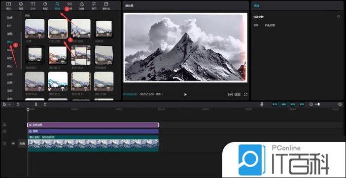 点击 特效按钮 ,选择复古中的白色边框特效, 将其添加到特效轨道中 ,见下图。