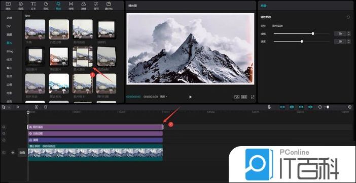 选择 胶片滚动特效 ,将其添加到特效轨道中,见下图。