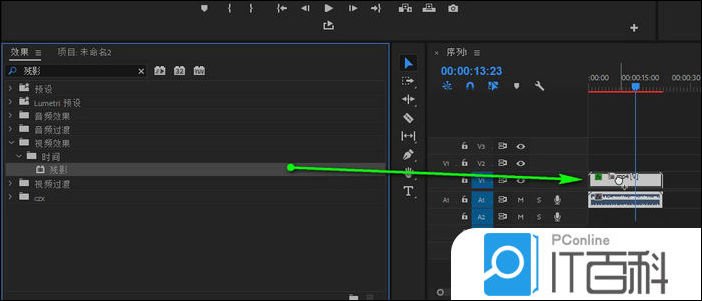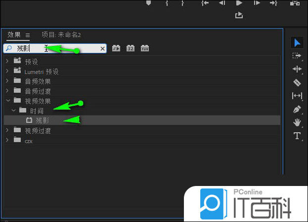3、在 效果 面板中搜索 残影 或者依次点击 视频效果-时间-残影 ,找到该效果。 如图示。