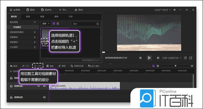 2.打开神剪辑软件,新建项目,导入拍摄的视频到软件的本地素材窗口,如图1。之后的素材导入软件操作也是一样的。然后选择视频轨道1,点击素材的“+”,添加视频到视频轨道1,如图2,之后的素材导入轨道的操作也是一样的。