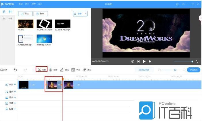 按照要求,将视频依次拖动到轨道上,使用分割工具将多余的部分剪掉,