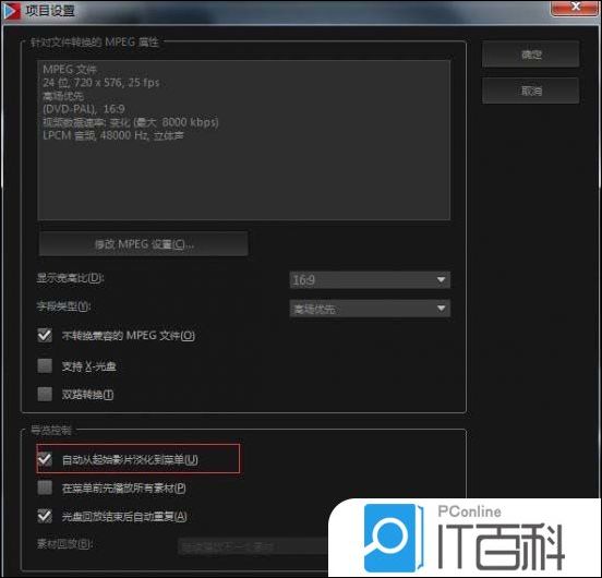 4、接下来,点击左下角的设置按钮,在弹出的窗口中勾选:“ 自动从起始影片淡化到菜单 ”后点击确定。