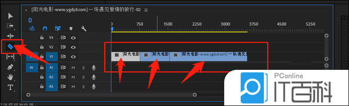 4、然后在序列编辑面板中将视频素材利用 剃刀工具 将其剪切成三段素材 ,如图