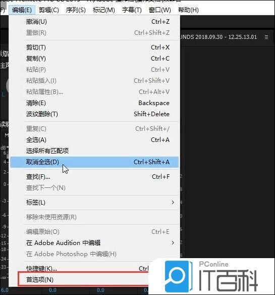 打开Premiere软件,新建一个项目,作为例子,然后在菜单栏中点击【编辑】——【首选项】——【音频】,