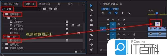 4、在“ 效果 ”面板搜索栏输入“ 变换 ”,将其拖到调整图层上