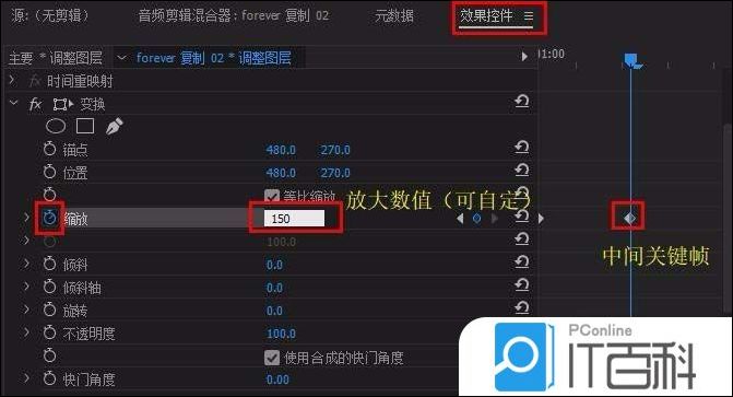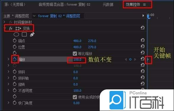 5、选中调整图层,在其“ 效果控件 ”面板中找到“变换”。将时间标尺移到调整图层开始处,打开“ 变换”-“缩放 ”前的动画图标,建立开始 关键帧 ,数值不变