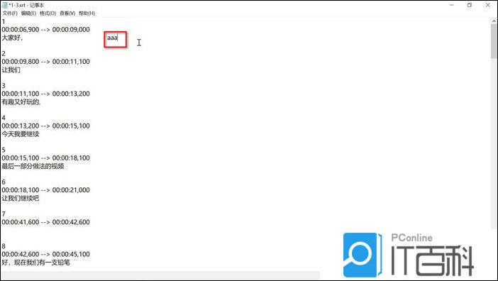 4、在如下图所示的记事本中,把第一段字幕内容的后面随意加上一些字符后点击保存该文件, 随后关闭该文件。