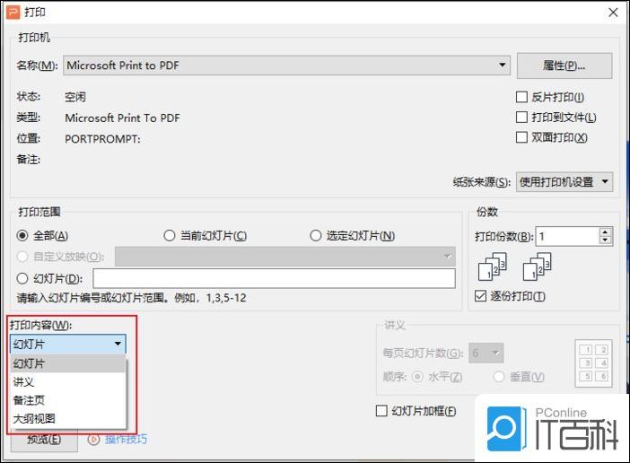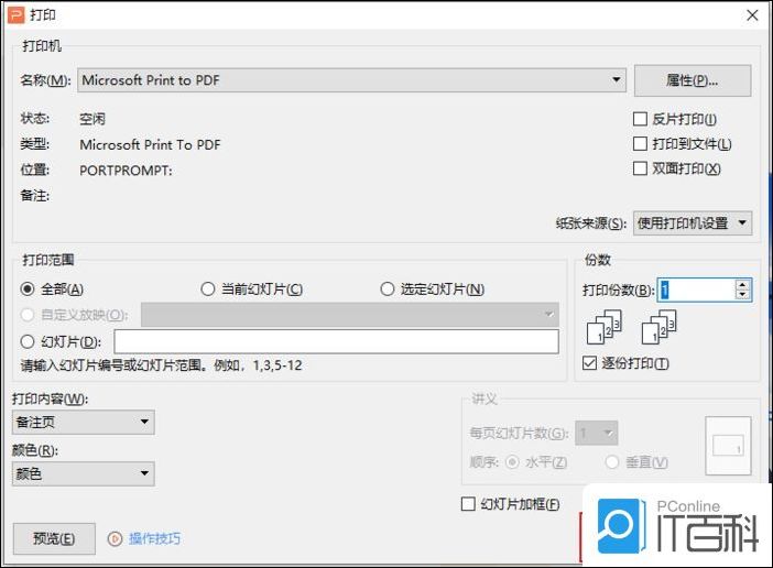点击左下角的预览,可以看到PPT下方的备注文字也显示在打印页面上了。