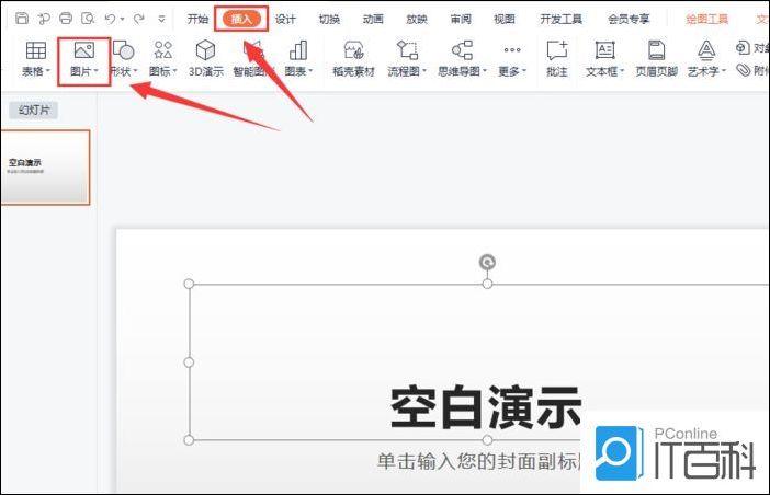 3、那么在演示文档页面上就会插入一张图片,拖动图片或者是调节图片的大小来适应页面的大小,点击文本框输入文字