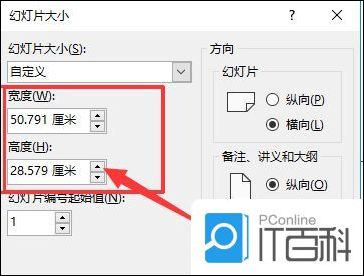3.选择自定义幻灯片尺寸后,会出现以下界面。将宽度改为50.791厘米,高度改为28.579厘米,点击确定。