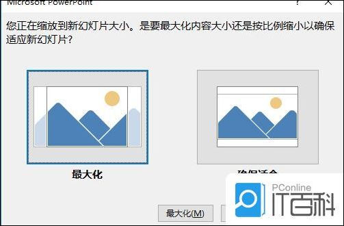 4.点击确定后,会出现另一个对话框。如图,选择最大化。鼠标点击图片最大化,点击选项最大化。这样PPT页面就变大了。