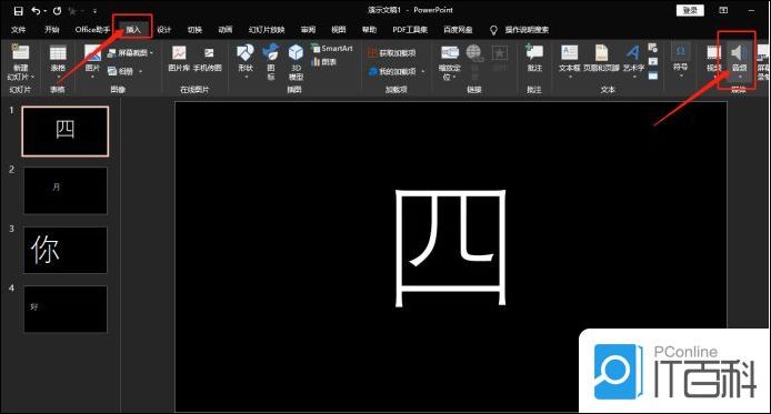 2, 在第一页插入音乐,点击菜单栏上边的【插入】按钮,选择【音频】来自文件中,如下图红色圈出部分所示: