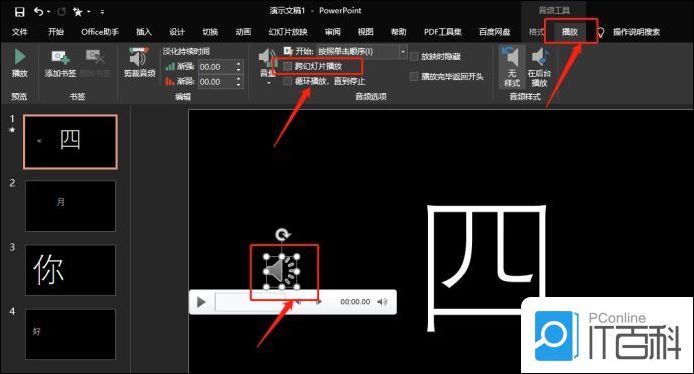 3,然后,点击上方的音频工具中的【播放】按钮,将其设置为【跨幻灯片播放】,并将小喇叭拖拽至外侧,使其播放时看不到,如下图红色圈出部分所示: