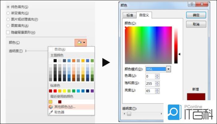 PPT纯色填充中的其他颜色可以调出颜色工具栏,选择HSL模式可以看到色相。