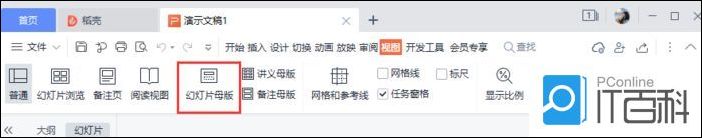4.在主幻灯片的显示画面中,点击“幻灯片尺寸”;