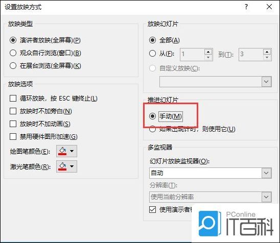 2.在弹出的对话框中,将放映方式改为手动,点击确认取消PPT自动播放模式。