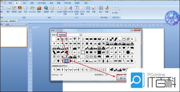 2. 字体选择:在搜索框输入Webdings—选择滑翔符号—点击插入