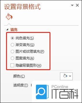 2.在弹出的“设置背景格式”窗口中,选择左侧的“填充”,就可以看到有“纯色填充”,“渐变填充”,“图片或纹理填充”,“图案填充”四种填充模式,在PPT幻灯片中不仅可以插入自己喜爱的图片背景,而且还可以将PPT背景设为纯色或渐变色。如图所示。