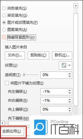5.之后回到“设置背景格式”窗口中,之前的步骤只是为本张幻灯片插入了PPT背景图片,如果想要全部幻灯片应用同张PPT背景图片,就单击“设置背景格式”窗口中右下角的“全部应用”按钮。如图所示。