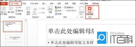 5.之后,在工具栏找到幻灯片母版,点击“关闭”即可。如图所示。