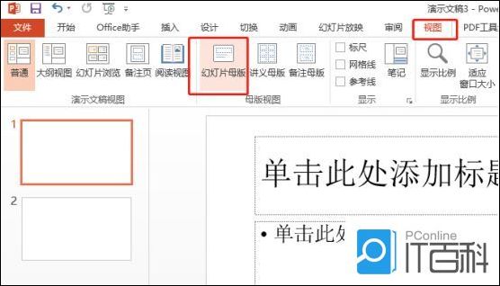 2.如果要想添加水印,需要先添加幻灯片母版。找到“视图”,点击“幻灯片母版”。如图所示。