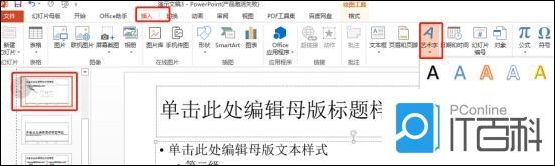 3.在幻灯片上选择第一张幻灯片,在工具栏找到并点击“插入”,选择其中一种你喜欢的“艺术字”作为水印即可。如图所示。