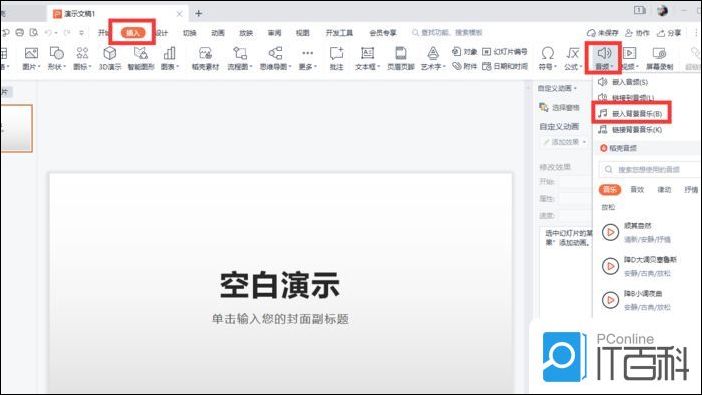 2、点击菜单栏的“插入”,在右上角找到“音频”,点击一下“嵌入背景音乐”
