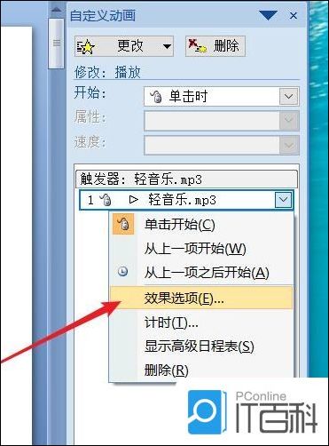 3、选择“效果选项”,将“播放声音”的对话框打开