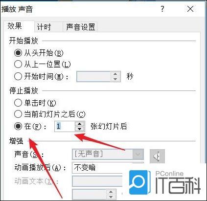 4、将播放声音对话框的停止播放在(F):1张幻灯片后的页数设置到自己想要停止的地方就可以了