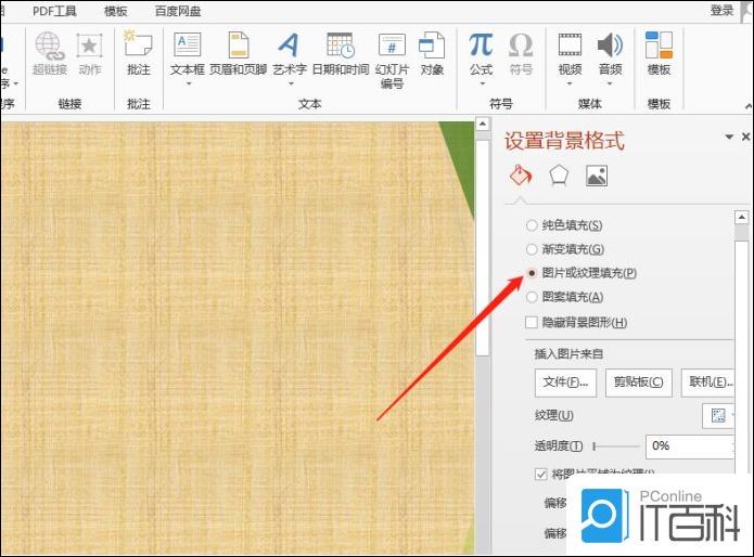 2、在设置背景格式工具中,点击图片或纹理填充处。