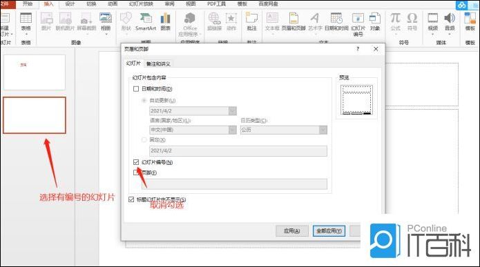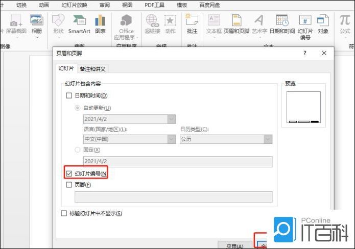 2,点击页眉和页脚之后,弹出选项窗口,找到下图中的“幻灯片编号”,并点击右上角的“全部应用”,PPT从封面开始右下角就会出现页码了。