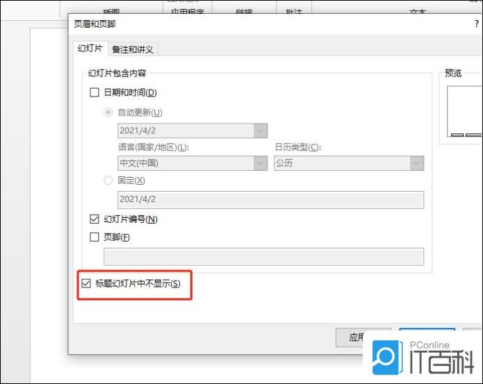 3,如果在幻灯片的封面不想显示页码,同时,第二页显示为2,那么需要继续点开页眉页脚的选项窗口,勾选下图中“标题幻灯片中不显示”。