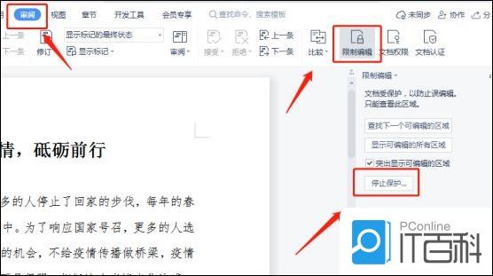 5.想要取消只读模式的话,还是点击“审阅”中的“限制编辑”,在“限制编辑”属性栏下有一个“停止保护”,左键单击。